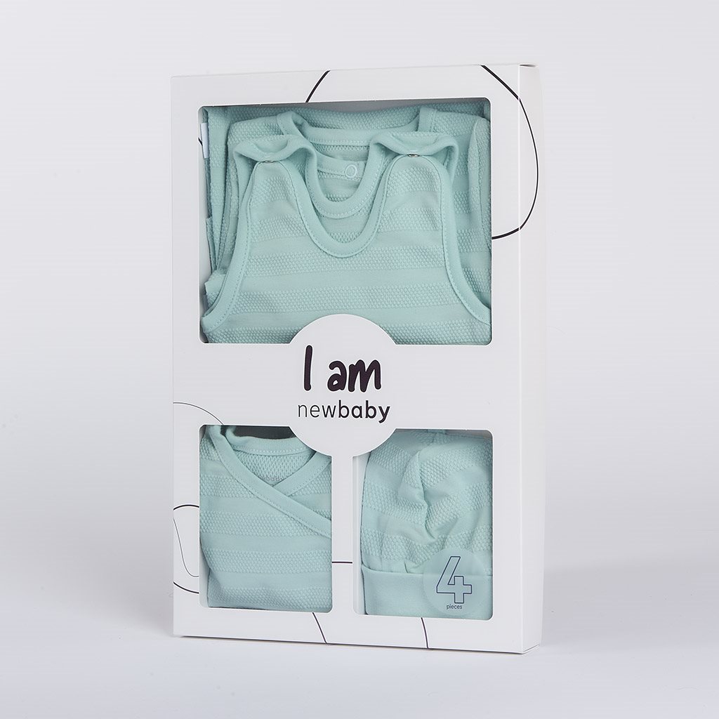 Roztomilá dojčenská 4-dielna súpravička New Baby I AM pre bábätká. Súpravička je vyrobená z veľmi príjemného, mäkkého a kvalitného materiálu, ktorý je vhodný pre bábätká a je vhodná nielen do pôrodnice. Obsahuje celorozopínacie body s dlhým rukávom, dupačky, kabátik a čiapočku. Body má bočné zapínanie po celej dĺžke a medzi nožičkami na cvočky. Dupačky majú zapínanie na cvočky na ramienkach a medzi nožičkami, čo uľahčí obliekanie a prebaľovanie. Kabátik má zapínanie na cvočky po celej dĺžke. Čiapočka so širším lemom dobre drží na hlavičke bábätka a nepadá. Je veľmi praktická a netlačí na hlavičku bábätka. Celá súpravička má nový neobyčajný dizajn s atraktívnym vzorom látky. Je navrhnutá s ohľadom na potreby bábätka a je vhodná aj ako milý darček. Súpravička je v praktickej Eko krabičke. Zloženie: 100% bavlna.