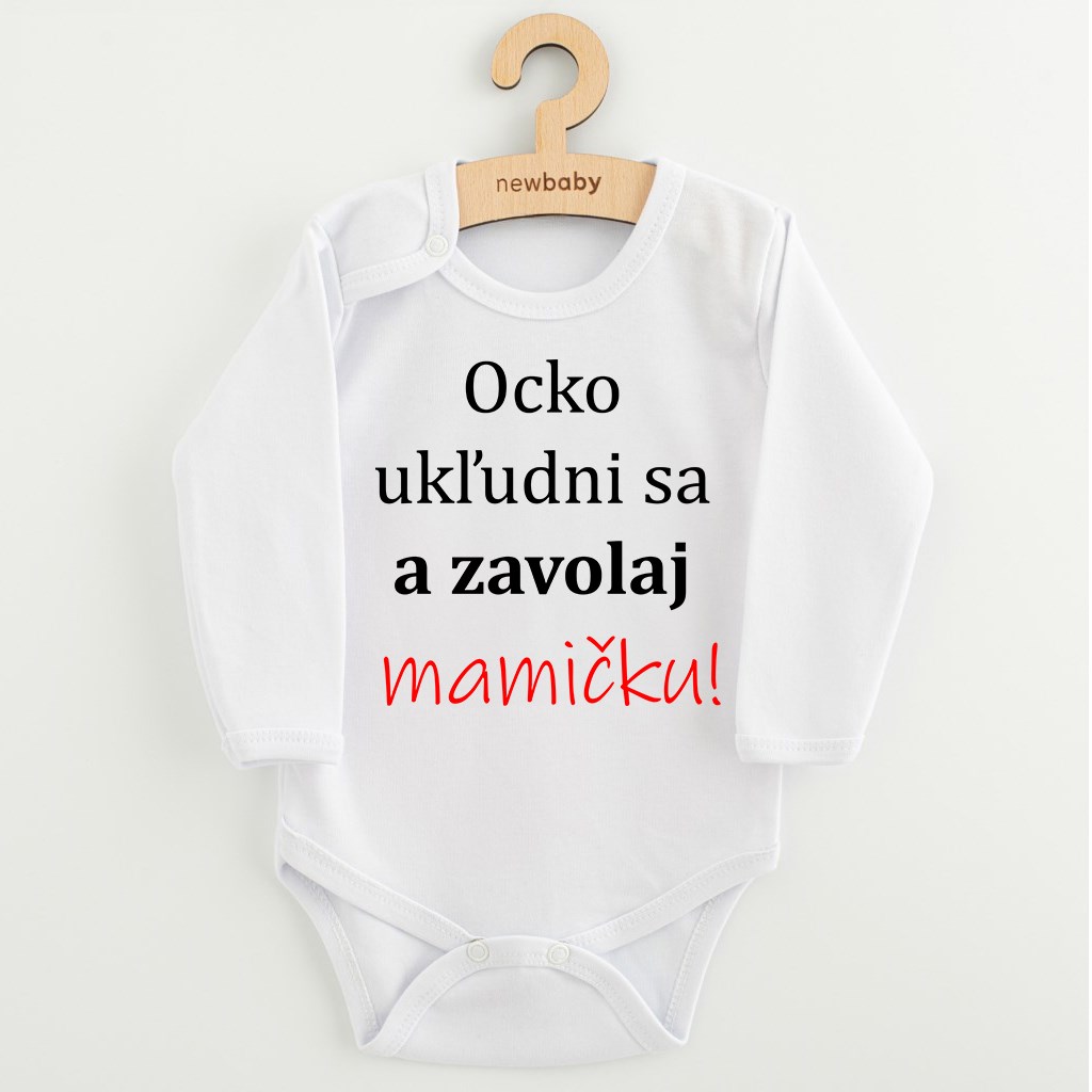 Originálne bavlnené dojčenské body s dlhým rukávom New Baby, s vtipným nápisom Ocko ukľudni sa a zavolaj MAMIČKU! Farby použité k potlači sú certifikované a vhodné pre bábätká. Je vyrobené z príjemného a kvalitného materiálu, v ktorom sa bude Vaše bábätko cítiť príjemne. Body má zapínanie na cvočky na ramienku a medzi nožičkami, čo uľahčuje obliekanie a prebaľovanie. Doprajte Vášmu bábätku vyniknúť v originálnom body. Zloženie: 100% bavlna. Rozmery: obvod okolo hrudníka cca 34 cm, dĺžka rukáva cca 16 cm, celková dĺžka cca 30 cm.