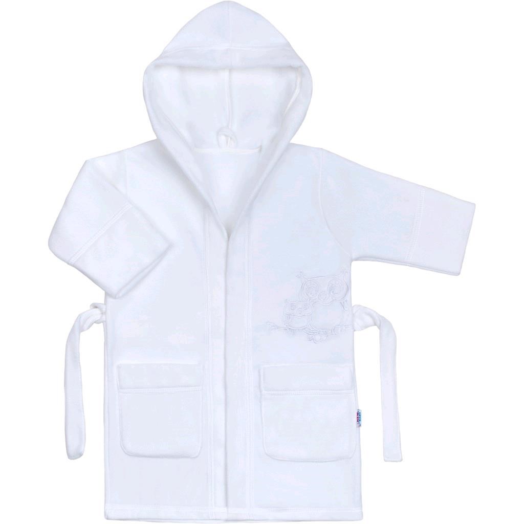 Detský župan New Baby Sovičky. Župan zdobí obrázok sovičiek, kapucňa a dve vrecká. Kapucňa chráni mokrú hlavičku pred chladom a mäkký, teplý materiál je ideálny pre citlivú detskú pokožku. Detský župan sa zaväzuje na šnúrky. Rozmer: dĺžka od ramienok cca 68 cm, obvod okolo hrudníka cca 82 cm, dĺžka rukáva cca 35 cm. Zloženie 100% polyester.