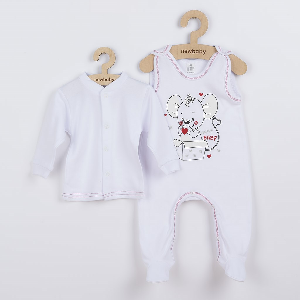 Nápaditá bavlnená dojčenská súpravička New Baby Mouse pre bábätká. Súčasťou súpravičky sú dupačky a kabátik. Kabátik je jednofarebný. Zapínanie na cvočky po celej dĺžke uľahčuje obliekanie. Dupačky sú zdobené farebným lemovaním a veľkým obrázkom myšky. Zapínanie na cvočky na ramienku a medzi nožičkami uľahčuje obliekanie a prebaľovanie. Súpravička má veľmi príjemnučký a kvalitný materiál, ktorý je ideálny pre bábätká. Zloženie: 100% bavlna. Produkt českej značky.