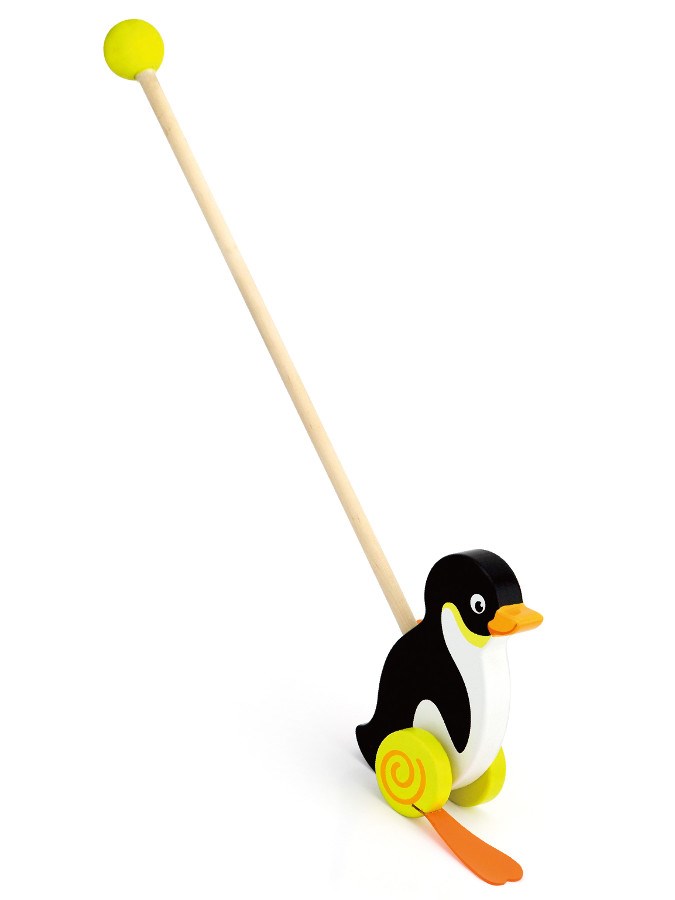 Krásna drevená hračka na tyči Viga Tučniak je skvelou alternatívou ťahacích hračiek pre deti. Perfektná edukačná hračka. Ideálna na spoločné prechádzky a hranie doma. Gumové prvky pripojené na kolesá vtipným spôsobom napodobňujú chôdzu zvierat. Hračka pomáha zlepšiť manuálnu zručnosť a obratnosť, učí dieťa rozpoznať tvary a farby, zapája a rozvíja zmysel pre pozorovanie. Hračka je vyrobená z lakovaného dreva. Našou prioritou je bezpečnosť a kvalita našich výrobkov, a preto farby použité na hračkách nie sú toxické a spĺňajú bezpečnostné štandardy (EN71 a ASTM). Rozmery hračky: dxvxš 15×8,3×5,6 cm. Určené pre deti od 2 rokov.