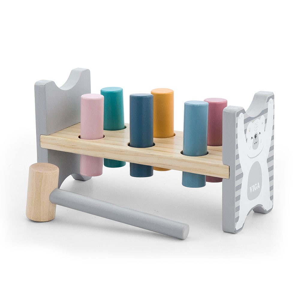 Farebná, drevená zatĺkačka Viga, ktorú si zamiluje každé malé dieťa. Drevená doska so šiestimi otvormi a paličkou pre nácvik zatĺkania. Po zatlčení kolíkov sa stojanček môže obrátiť a začať zatĺkať znova. Sada obsahuje stojanček, 6 farebných kolíkov a kladivko. Hračka určená pre deti od 2 rokov. Našou prioritou je bezpečnosť a kvalita našich výrobkov, a preto farby použité na hračkách nie sú toxické a spĺňajú bezpečnostné štandardy (EN71 a ASTM).