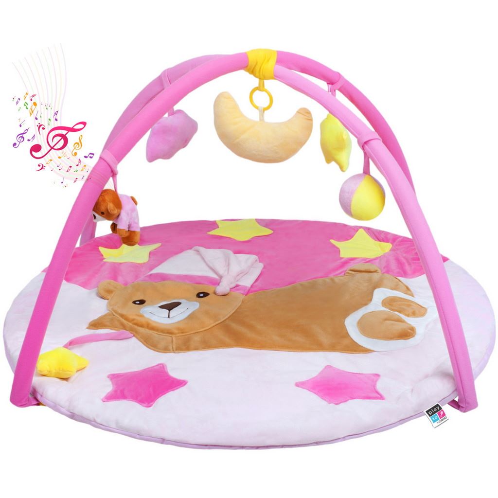 Krásna originálna vzdelávacia hracia deka s melódiou PlayTo s hrazdou rozvíja detskú predstavivosť vďaka spoznávaniu farieb a tvarov. Hracia deka v krásnej žiarivej farbe s motívom medvedíka. Rozvíja zmysly hmatu, zraku aj sluchu vďaka šuštiacim a pohyblivým častiam. V mesiačiku je ukrytý hrací modul, ktorý po stlačení hrá melódie. Príjemný a mäkký materiál umožňuje pohodlné ležanie na brušku alebo chrbte a umožňuje slobodu pohybu Vášho dieťaťa. Bábätko tak môže získať bezpečný útulnejší priestor a motivuje na dvíhanie sa dieťatka. Hračky je možné z hrazdičky ľahko zložiť. Vhodné pre deti od 3 mesiacov. Rozmery: cca 87 cm. Výška: cca 41 cm.