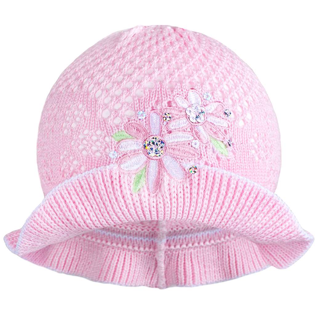 Jarný pletený klobúčik New Baby. Klobúčik zdobí obrázok kvietkov a farebný lem. Zloženie: 100% bavlna. Materiál je pružný. Obvod okolo hlavičky cca 40-50 cm.